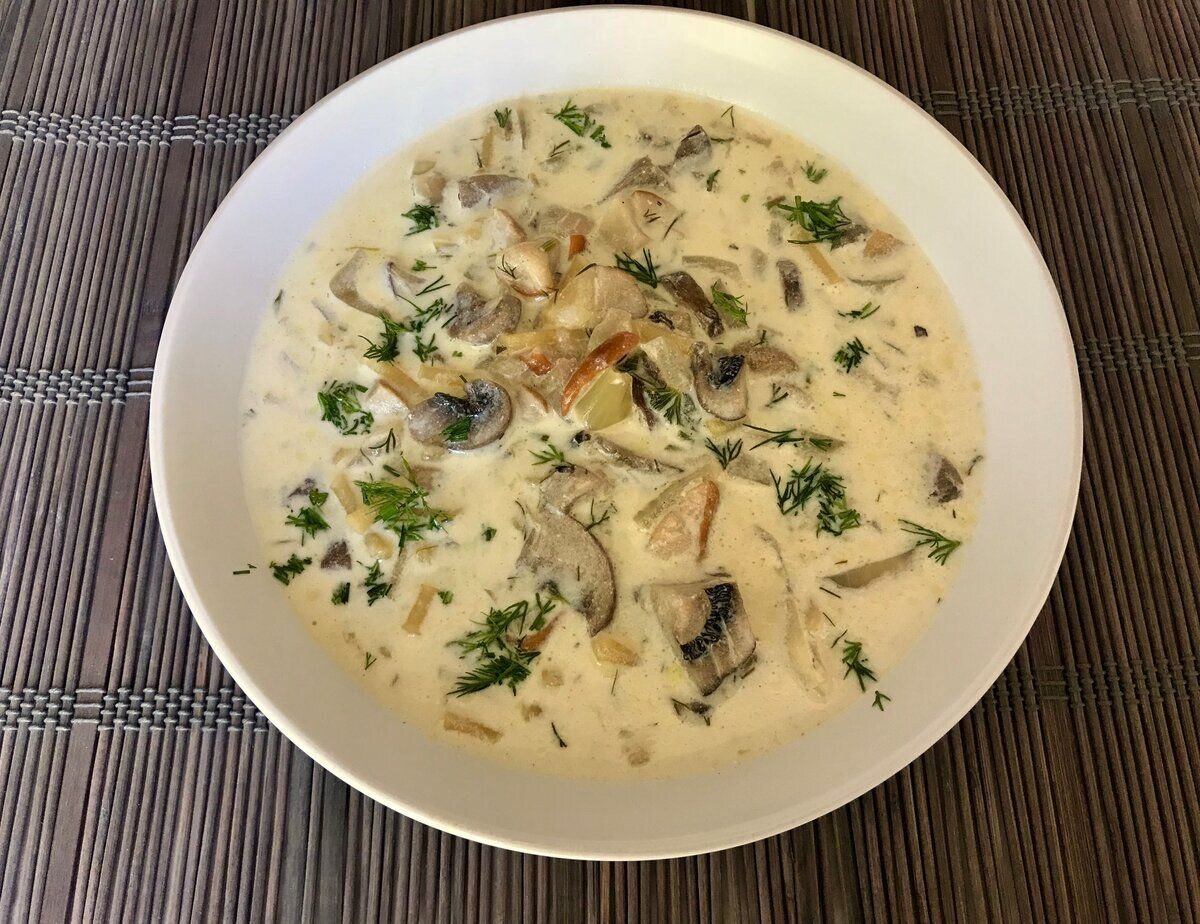 КБЖУ 32.58/1.68/1.07/4.07 Ингредиенты: ▫️2 л воды ▫️500 мл куриного или овощного бульона ▫️4 средних картофелины ▫️900 г грибов ▫️200 мл молока ▫️200 мл сливок ▫️4 ст.л. муки (для загустения, можно без) ▫️1 головка лука ▫️1 морковка ▫️Соль, перец,Зелень Приготовление: ▫️Картофель почистить, нарезать, залить водой и бульоном, довести до кипения, варить 10 мин. В это время нарезать лук, грибы, натереть морковь, жарить на среднем огне сначала лук 5 мин, добавить морковь и грибы, жарить ещё 8-10 мин. ▫️Добавить лук-морковь-грибы в кастрюлю с супом, варить 8 мин. Смешать молоко, сливки и муку, добавить к супу, посолить, поперчить, довести до кипения. Готово!