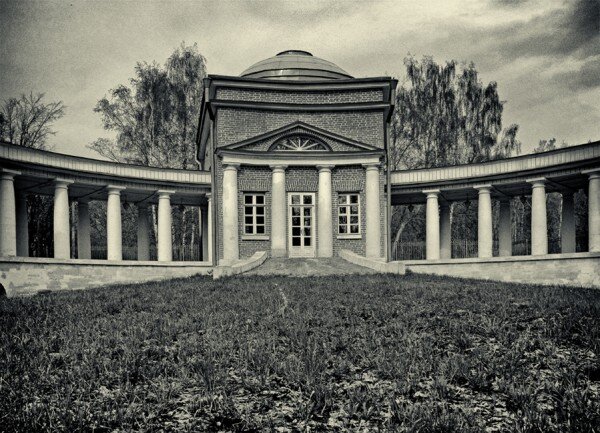 И начал с изучения архитектурных объектов усадьбы Голицыных в Кузьминках. Но когда я нашел этот античного вида объект, то оказалось, что это вовсе никакой не "храм" и тем более не христианский. Вообще на территории этой усадьбы довольно много архитектурных объектов явно античного вида. Но знаете как называется вот этот архитектурный объект с характерной полукруглой колоннадой как у Казанского собора в Санкт-Петербурге?