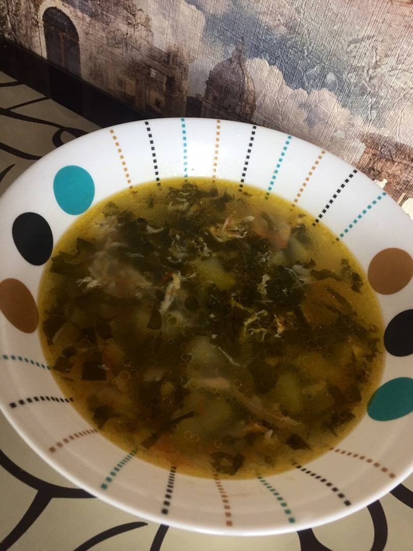 Ингредиенты: Части курицы (вообще для бульона можно использовать любое мясо,не обязательно курицу), Картофель, Морковь, Лук (1 в бульон + пережарка), Щавель , Яйцо Способ приготовления: Готовим бульон.. в моем случае курица.. обжарить до легкого румянца (не обязательно обжаривать. Можно варить привычным способом)..в кастрюлю налить воду. Довести до кипения и выложить мясо +1 луковица очищенная.. варить бульон мин 30. Мясо достать, разобрать.. лук выкинуть.. мясо вернуть в бульон. Картофель нарезать привычным способом и добавить в бульон.. Пока варится картошка. Сделать пережарку лук + морковь.. добавить в кастрюлю. Картофель сварился.. Щавель порезать и добавить в кастрюлю.. варить мин 3-5 (по цвету будет ясно -готов) посолить по вкусу. Яйцо разбить и хорошо размешать вилкой и тонкой струйкой влить в суп, при этом постоянно помешивая.. выключить огонь. Накрыть крышкой и дать постоять мин 10-15..супчик готов.. по желанию можно яйцо не вливать, а добавить порционно в тарелку варёное при