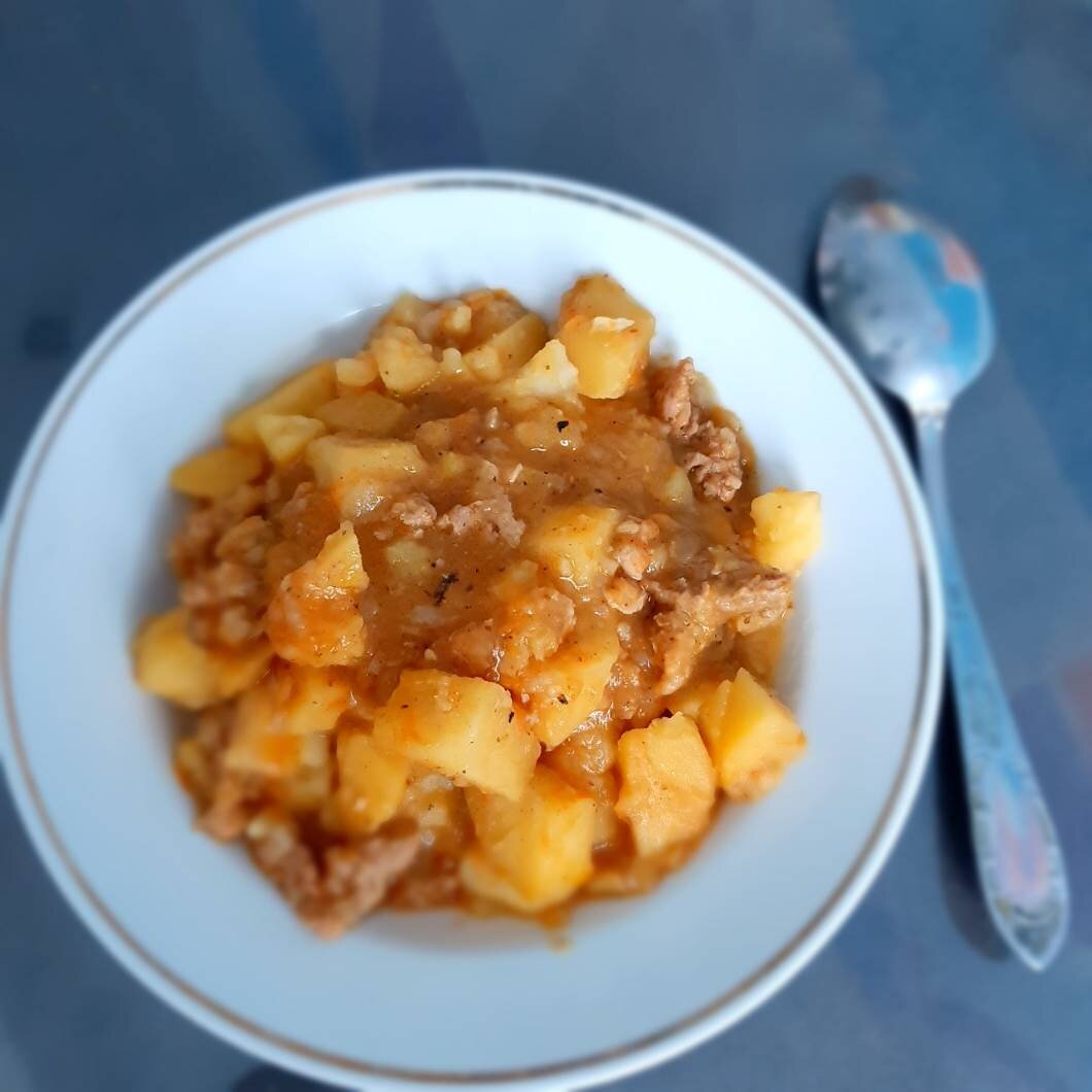 Ингредиенты: Картофель, Лук, Морковь, Соль, специи, Фарш мясной Способ приготовления: Картофель очистить и порезать на кусочки. Лук мелко порезать. Морковь натереть на терке. Фарш обжарить в кастрюле на растительном масле затем добавить лук морковь, специи и еще немного обжарить. На фарш выложить картофель, посолить и залить водой. Довести до кипения, после чего убавить огонь и на медленном огне тушить примерно 30 минут. Добавить мелко нарезанную зелень. Можно наслаждаться вкусной картошкой!