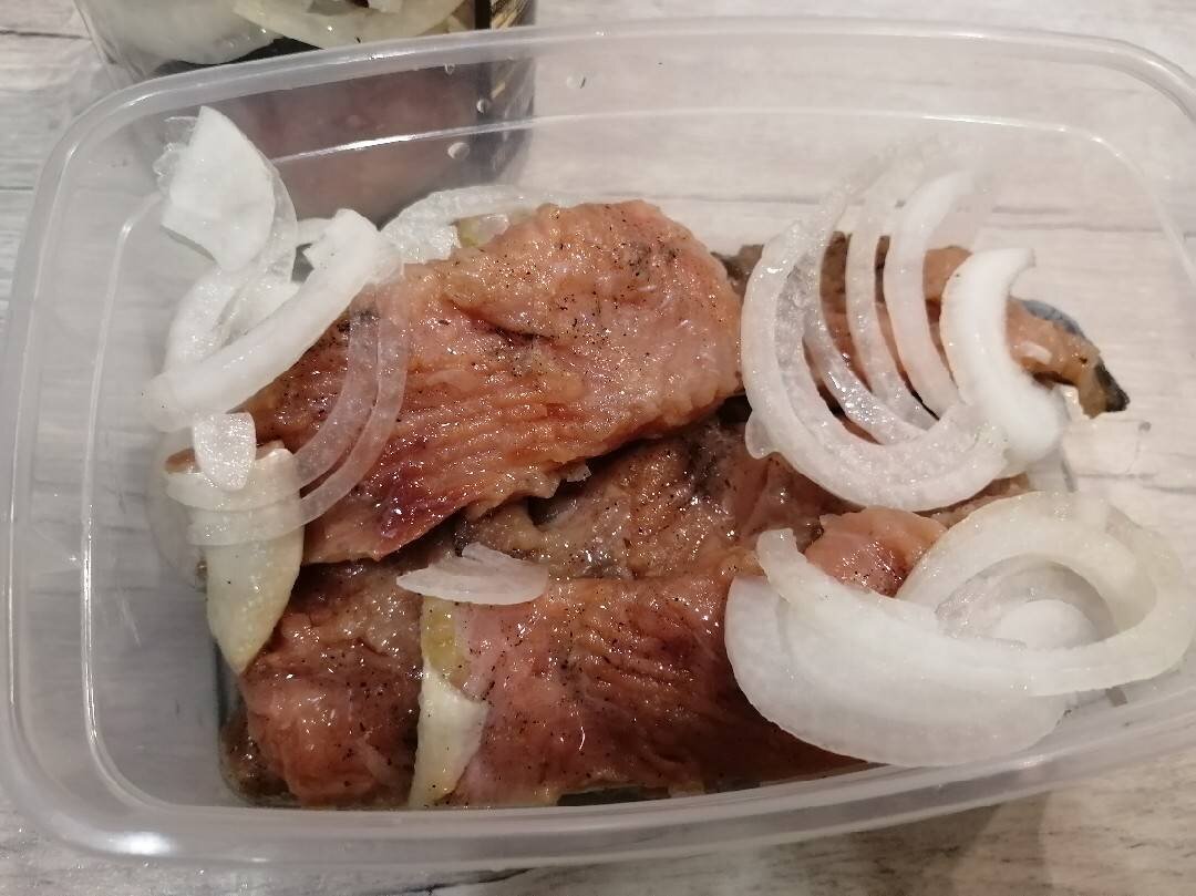 Наша семья очень любит рыбу, причём любую, в любом формате и способе приготовления! Без солёной горбуши не обойтись) Очень нежная, вкусная, подойдёт к любому гарниру или просто как закуска! Ингредиенты: Горбуша свежая, Соль, перец чёрный, Сахара, Лук репчатый, Масло подсолнечное Способ приготовления: Взяла крупную рыбу, как раз 1 кг, уже очищенная от внутренностей. Рыбку почистить от чешуи, промыть водой, отрезать все плавники, отрезать голову и хвост. Протереть бумажным полотенцем досуха. Затем острым ножом порезать на равные куски (стейки), а каждый кусочек порезать на пополам. Очистить от мелких костей. В некоторых кусочках хребет я убрала, а в меленьких оставила. Солим, перчим каждый кусочек и слегка втираем рукой, добавляем сахар. Сложить все куски в глубокую чашу, накрыть пищевой плёнкой и убрать в холодильник на сутки. Через сутки достать рыбку с холодильника, лишнюю жидкость слить Затем лук очищаем, режем на полукольца, добавляем к рыбе. В конце подсолнечное масло влить к рыбе,