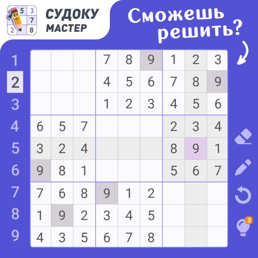 Решим судоку! Изучите игровое поле, найдите числа и заполните все ячейки.