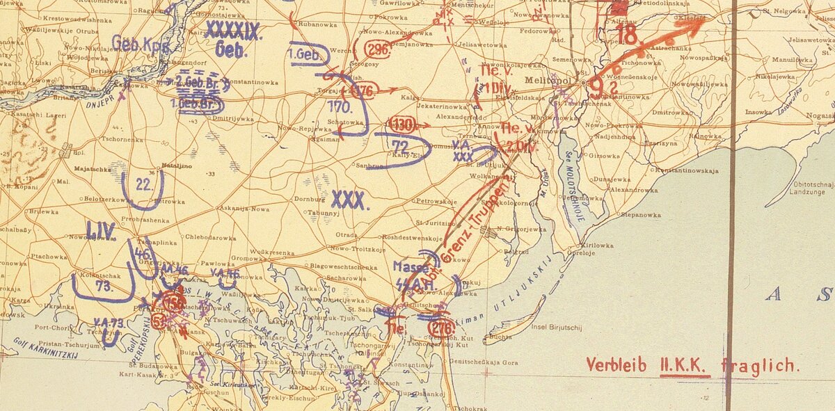 Противник в описании событий тоже краток. «Лейбштандарт» в донесении в штаб 30-го корпуса сообщает об атаках в районе южнее Сальково, станции Партизаны и д. Юзкуи, попытке высадки в районе Ново-Михайловки, и о советской группировке на полуострове южнее Громовки, численностью до 1,5 тыс. человек[1].
