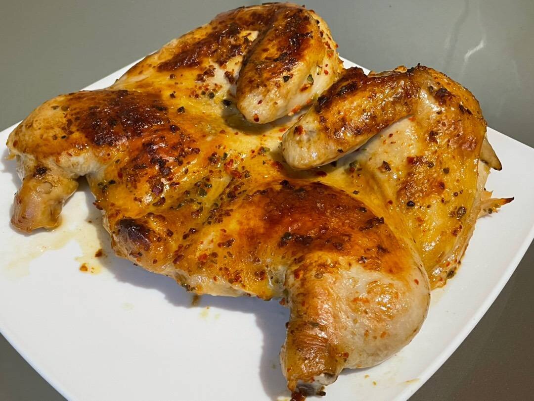 #среда Рецепт позаимствовала у известной продуктовой сети. Замечательный цыплёнок получился 😋 Очень вкусно и питательно! Ингредиенты: Тушка цыплёнка -бройлера охлаждённая (замаринованная), Соль, Уксус яблочный 9 %, Масло растительное для жарки, Сливочное масло, Чеснока, Хмели-сунели Способ приготовления: Цыплёнка разрежьте вдоль по спинке и раскройте, обсушите бумажным полотенцем. Смажьте специями и маслом. Когда сковорода нагреется, положите промаринованную курочку кожей вниз, сверху придавите тяжёлым грузом. Например, плоская тарелка и сверху полный чайник с горячей водой (чтобы не было перепада t). Жарьте на хорошо разогретой сковороде по 15 минут с каждой стороны. Следите, чтобы тушка не пригорела. В конце влейте в сковороду уксус и дайте жидкости выпариться. Выдавите на цыплёнка чеснок. Когда цыплёнок подрумянится - отправляем в духовку, приправив (по желанию) разными специями минут на 15. Перенести плоскую курочку на большую тарелку. Подавайте цыплёнка горячим со свежим салатом