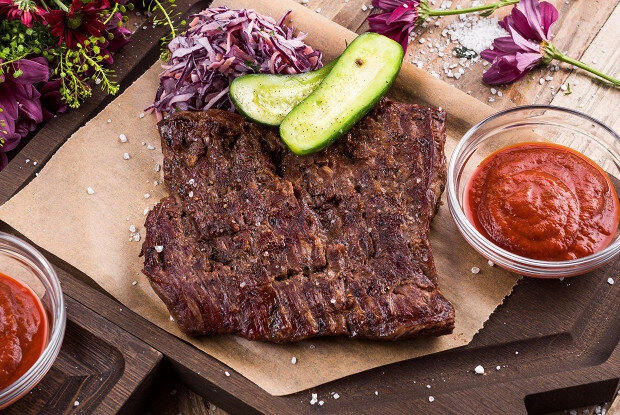 ИНГРЕДИЕНТЫ ПОРЦИИ 4 Говяжья диафрагма 250 г Огурцы 40 г Сацебели 40 г Морская соль 3 г Молотый черный перец 1 г 1.Диафрагму комнатной температуры посолить, поперчить и обжарить на гриле, до прожарки medium около 2-3 минут с каждой стороны. 2.Затем готовое мясо накрыть фольгой и дать отдохнуть 1.5-2 минуты. Мясо должно дойти до прожарки medium well. 3.Далее выложить готовую диафрагму на тарелку, посыпать морской солью. Подать к блюду огурцы и сацебели. Понравился рецепт — поделитесь им с друзьями в социальных сетях! Готовьте вместе с «Едой»!
