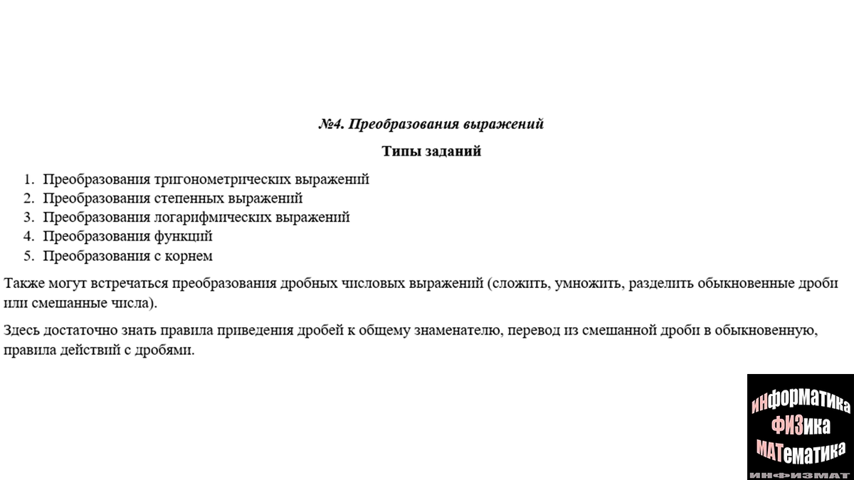 Какие задания могут встретиться в №4 на преобразования выражений в ЕГЭ математика профильный уровень?