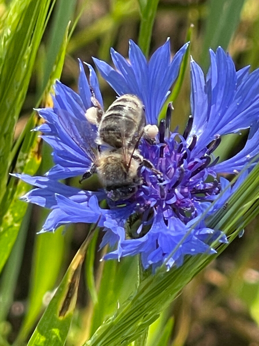 Смачивая своими слюнными железами, пчёлы формируют комочек и складывают в мешочки, которые находятся на задних лапках к пчёл. На первом фото видно у пчелки на двух задних лапках белые комочки- это цветочная пальца белого цвета собранная с василька полевого. После того как они собрали пыльцу, могут ещё и мёда в зобик набрать. Всего набрали и полетели домой. Лететь могут 2-3 км. Бывает ветер, дождь, но пчёлы на Урале такие выносливые, что их это не пугает. Долетев до дома они начинают закладывать пыльцу в ячейку и утрамбовывать ее головой. После того как все утрамбовали, заливают мёдом. На фото видно как в ячейках пчёлы наложили фиолетовую и жёлтую пыльцу. Далее пчёлы начинают поддерживать специальную температуру, влажность и под ферментами пчёл происходит молочнокислое брожение, которое длится несколько дней. В итоге пчёлы получают белковый корм для своих личинок, который мы называем ПЧЕЛИНЫМ ХЛЕБОМ / пергой. Так же пергу пчёлы используют для приготовления маточного молочка.