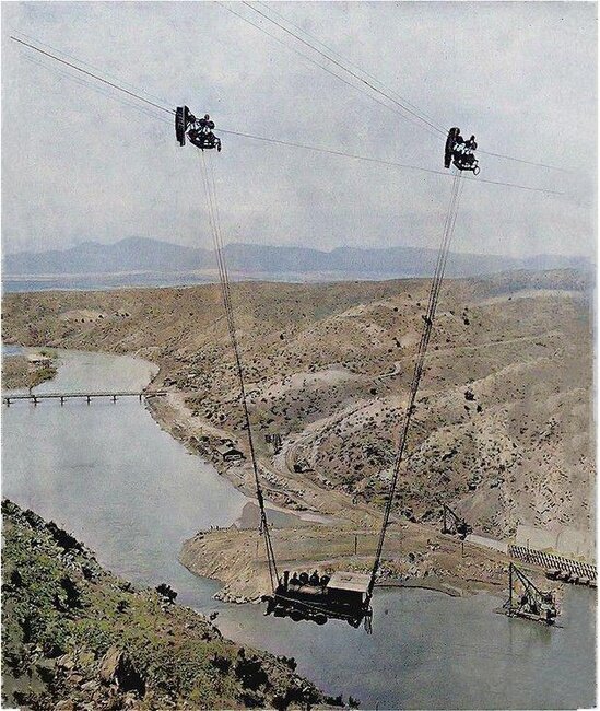 Интернет, как обычно, путается в показаниях и датирует изображение различными годами в промежутке от 1915 до 1930 года. Мы взвесили на редакционных весах авторитет всех источников, и перевесили эксперты, которые называют 1915-й. Мы с ними согласны. А вот с чем нет никаких исторических разночтений, так это с местом ситуации и самой ситуацией. Перед тобой фотоснимок переправы парового локомотива через каньон реки Рио-Гранде на канатах в американском штате Нью-Мексико. Вес паровоза — примерно 20 тонн. Расстояние между опорными башнями — 450 метров. Тебя стопудово удивляет тот факт, что столь удивительные вещи железнодорожные инженеры и рабочие проделывали сто лет назад, а почему-то сейчас таких картинок нигде не увидишь. Дело в том, что в наше время требования по безопасности труда многократно строже, чем в начале XX века. Поэтому подобные выкрутасы на колоссальной высоте тогда дозволялись, а сейчас тебе не только не выдадут разрешения, но и страховку аннулируют. И правильно