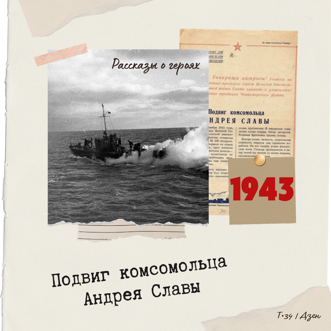 Краснофлотец Слава Андрей Иванович, строевой сторожевого катера СКА-05 отдельного отряда сторожевых катеров Азовской военной флотилии Черноморского флота, родился в 1921 году. Украинец. Рабочий. Комсомолец. На флоте с 1940 года. Участвовал в обороне Одессы, Севастополя, Сталинграда. Особо отличился при высадке десанта на Керченский полуостров в ноябре 1943 года... ☆ ☆ ☆ Дело было 7-го ноября 1943 года, в день 26-й годовщины Великой Октябрьской социалистической революции. Исторический доклад товарища Сталина, его приказ № 309 воодушевили черноморских моряков на новые подвиги. Одна мысль, одно желание владело сердцами советских воинов — изгнать ненавистных захватчиков из советского Крыма, приблизить день окончательной победы над немецко-фашистскими извергами. Подходивший к месту высадки десанта сторожевой катер был встречен сильным артиллерийско-минометным огнем противника. В машинное отделение попал снаряд. Катер загорелся. Команда бросилась тушить пожар. Вскоре новая, казалось, смертел