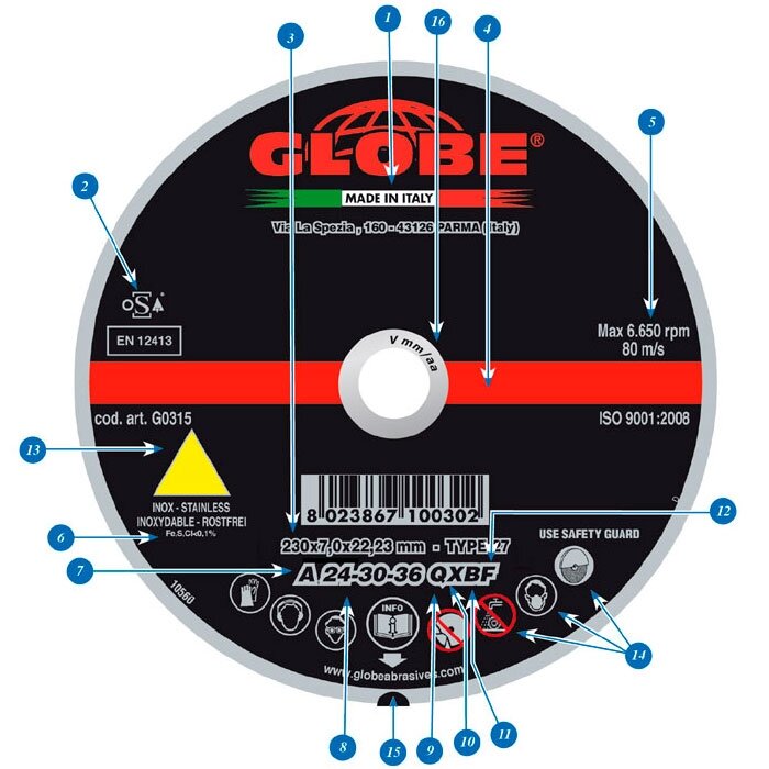 Сегодня поговорим о кругах бренда GLOBE. На фото цифрами подписана информация: 1. Производитель.
