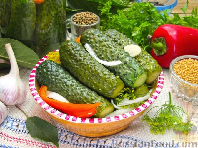 Малосольные огурцы с горчицей. Огурцы солятся с кусочками болгарского перца и репчатого лука, зернами горчицы, кориандра и другими пряностями. Получаются хрустящими, ароматными и слегка пикантными. Замечательные малосольные огурцы с горчицей будут готовы уже через трое суток. Но этого дождаться очень сложно, такие огурчики вкусные!)