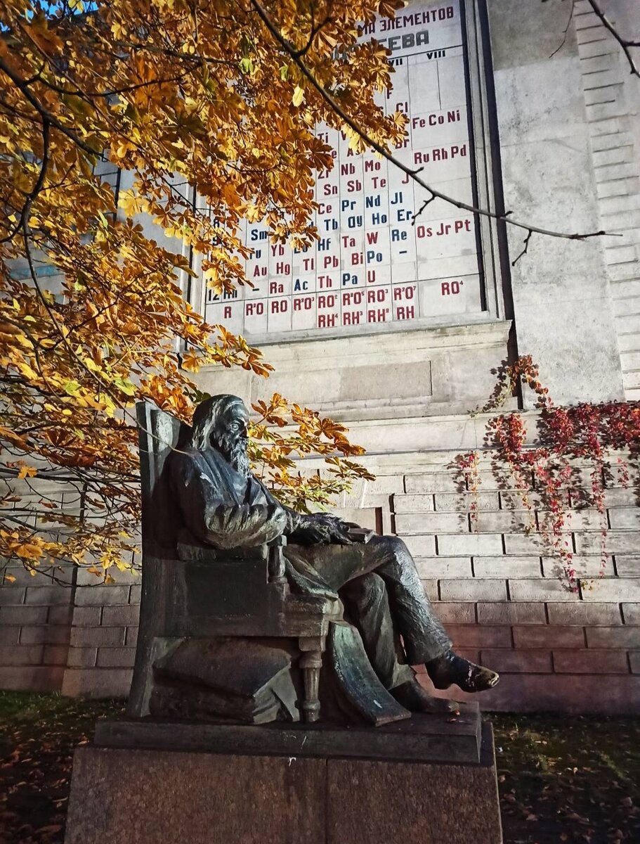 Хорошие мои! Хочу вам рассказать об этом уникальном памятнике. Менделеев и его секрет. Из книги С. Носова «Тайная жизнь петербургских памятников»: По крайней мере два раза в год – по сдаче весенних экзаменов и 1 сентября - бронзовому Менделееву благодарные студенты Технологического института чистят нос. Подозреваю, они пользуются химическим реактивом. Бородатый, длинноволосый Дмитрий Иванович не кажется обиженным на студентов. Сверкающий даже в пасмурную погоду нос выглядит диковато, но выражение лица в эти дни у памятника снисходительно-добродушное: эх, дураки, дураки! Он сидит в кресле вальяжно, нога на ногу, в скверике около дома, в котором когда-то жил. Соответственно и обстановка очень домашняя. Это, пожалуй, самый домашний памятник в городе. Один из самых неброских. Можно пройти мимо и не заметить. Очарователен беспорядок под креслом – груда книг, какие-то свитки... Все очень предметно. Конкретно. Буквально. Причем буквально «буквально»: на одном из ученых трудов, лежащих под