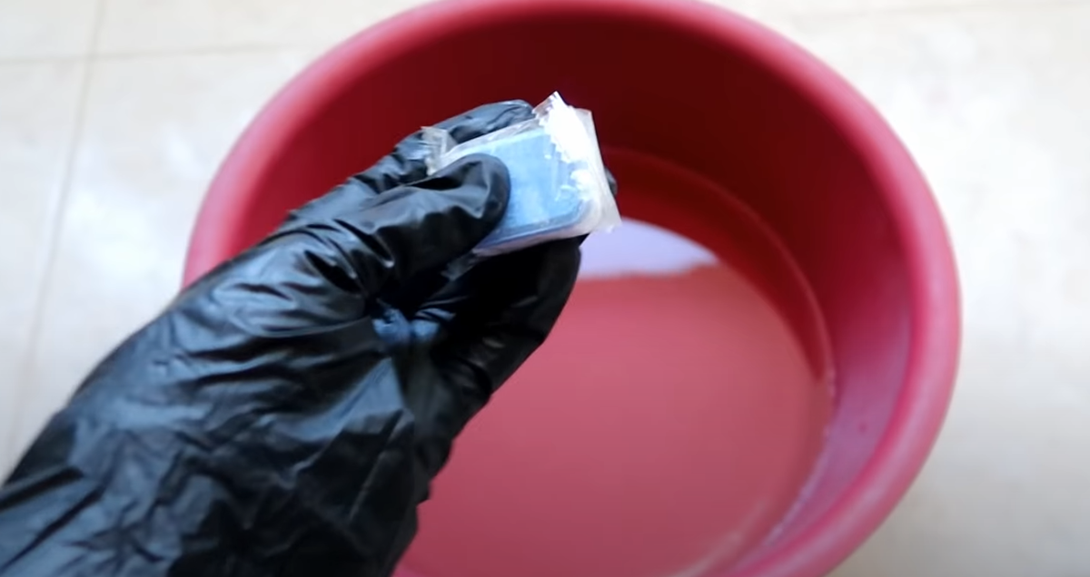 Друзья, всем привет. Сегодня достала белые кроссовки и ужаснулась - они все в пятнах, желтые. Срочно нужно было что-то сделать, а вернуть белой обуви прежний вид очень сложно. Если у вас испачкана подошва, это тоже тяжело убирается. Но сегодня я покажу очень простой способ, как быстро и просто без всяких лишних телодвижений очистить кроссовки, буквально за несколько часов. Мы их просто опустим в раствор, который сейчас приготовим, оставим обувь там, после этого достанем и высушим. Они будут как новенькие. Для этого способа я беру тазик, добавляю горячей воды (градусов 50), где-то два с половиной литра. Сюда же я добавляю самую обычную и дешевую таблетку для посудомоечной машины. Еще есть таблетки подороже, с шариком внутри - такие работают хуже, так что брать их не нужно. Вынимаем таблетку из упаковки и растворяем в тазике. Теперь я беру кроссовки, вынимаю шнурки и кладу все это отдельно друг от друга в тазик. В моем случае подошва у кроссовок чистая, грязный только верх, поэтому я их