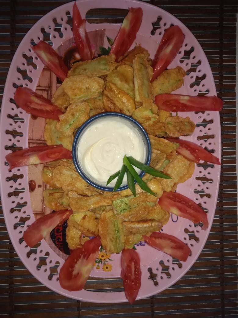 #літо Ингредиенты: кабачок, муки, яйца, майонеза, чеснока, сыра, паприка, соль, розмарин сухой, помидорки, зелень для украшения, подсолнечное масло для жарки Способ приготовления: Кабачки почистить от шкурки (у молодых кабачков с тоненькой шкуркой-можно ее не чистить). Порезать тоненькими палочками или пластинками. Подготовить кляр: перемешать яйца, специи (паприка, соль, розмарин) и тертый на мелкую тёрку сыр. Добавить муку и хорошо перемешать. Можно еще добавить немного панировочных сухарей. Поместить в кляр кабачки. Хорошенько перемешать их в кляре руками, чтобы кляр прилип к кабачкам. Выложить руками на сковородку с разогретым маслом каждый кусочек, предварительно еще раз окунув его в кляре. Жарить на среднем огне пару минут на одной стороне без крышки, затем-пару минут на другой стороне под крышкой. С обеих сторон должна образоваться золотистая корочка. Готовые кабачки выложить на широкое блюдо, украсив помидорами и оставив место для соуса. Соус готовится из майонеза и мелко натёр