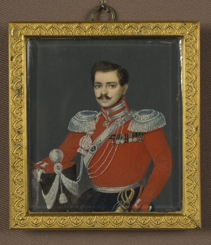 Перед нами штаб-офицер, то есть старший офицер в чине от майора до полковника, Лейб-гвардии Казачьего полка действительно на николаевское царствование. У персонажа видны ордена Св. Анны 2-ой степени, Св. Владимира 4-ой степени с бантом, несколько медалей, в том числе «В Память Отечественной войны 1812 г.» и «За взятие Парижа», «польский знак отличия за военное достоинство» (польский орден «Virtuti Militari», которым были награждены чины русской армии-участники подавления польского восстания 1830-31 гг.), а также, насколько можно рассмотреть, Золотая сабля «За храбрость».