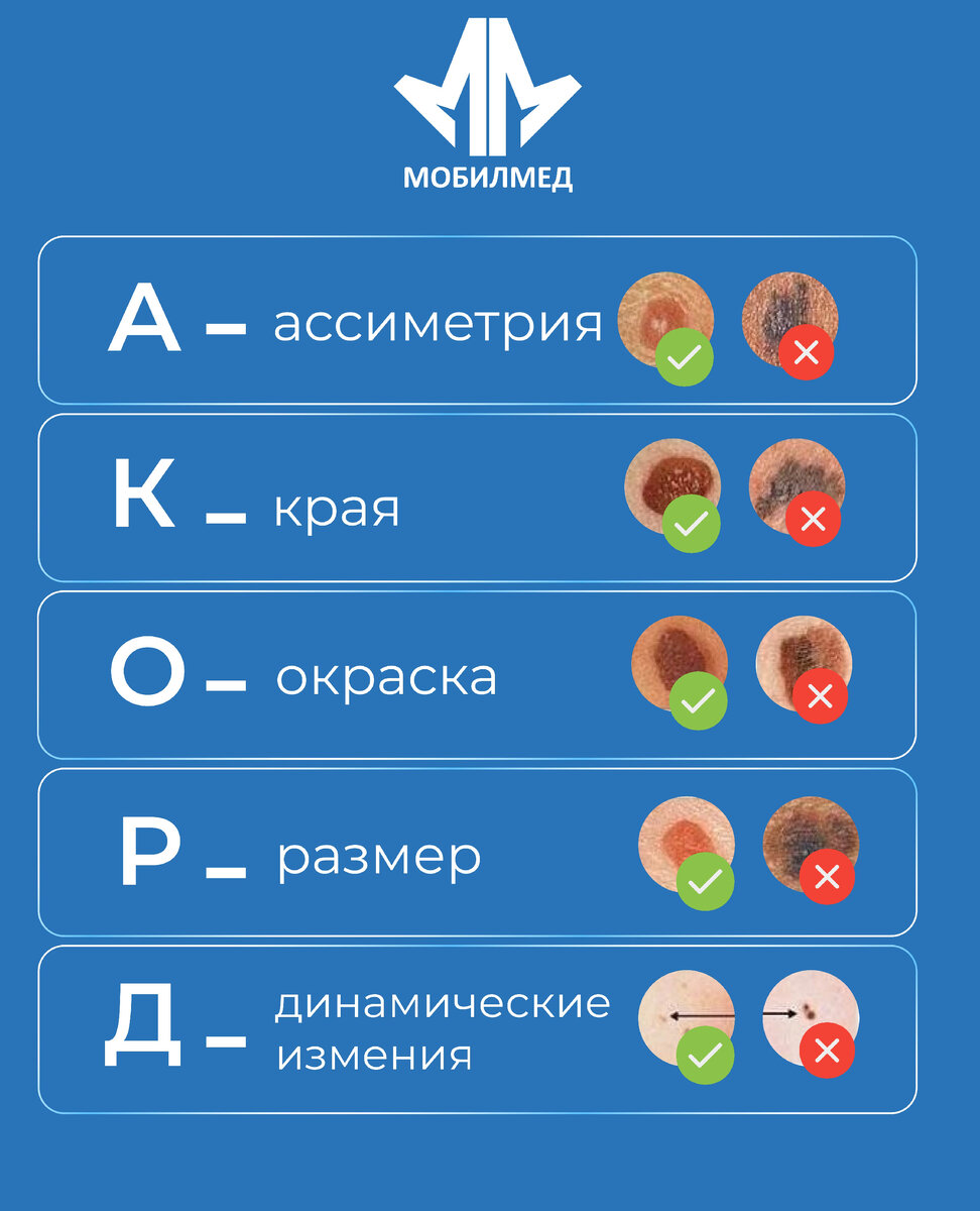 Д — динамичные изменения: родинка растёт, меняется, отличается от соседних.