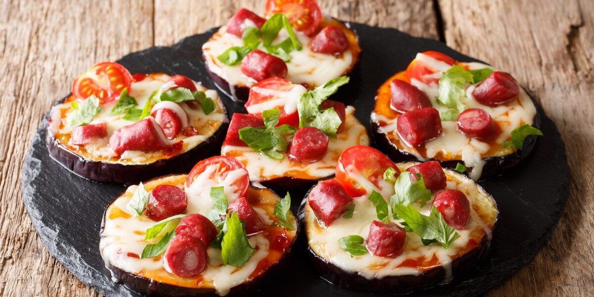 Ингредиенты Баклажан - 1 штука Соль - по вкусу Моцарелла - 70 г Копчёная колбаса - 50 г Помидоры черри - 5–6 штук Можно добавить Томатный соус - 3–4 ст. ложки Оливки без косточек - 5–6 штук Приготовление 1․Разогрейте духовку до 175 °С. Застелите противень пергаментной бумагой. 2․Баклажаны нарежьте толстыми кружочками, посолите и оставьте на 10–15 минут. 3․Моцареллу натрите на мелкой тёрке. Колбасу нарежьте кусочками. Помидоры разрежьте пополам. 4․Баклажаны слегка отожмите и выложите на противень. На каждый ломтик поместите немного колбасы и половину помидора. По желанию баклажаны можно смазать томатным соусом, а к начинке добавить оливки. 5․Посыпьте сыром и запекайте в разогретой духовке около 25 минут до готовности. #Еда #Рецепты