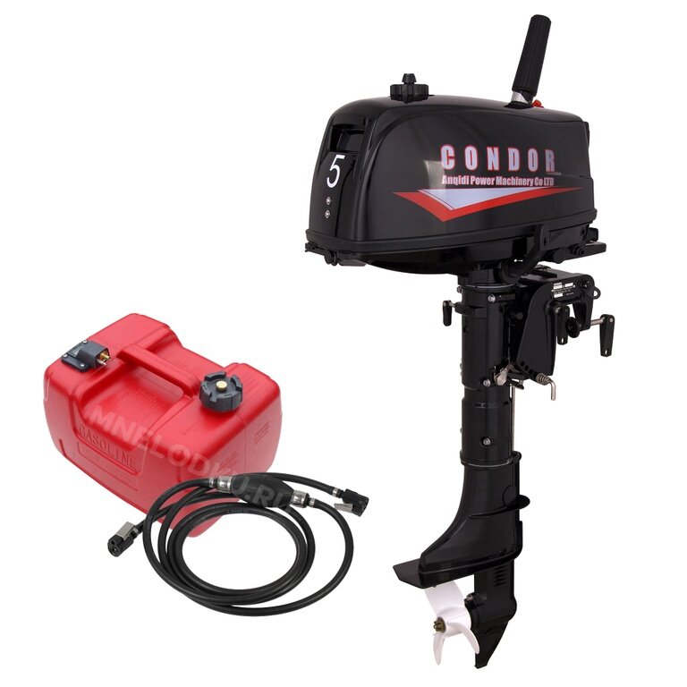 Лодочные двигатели Кондор производится на заводе Zhejiang Anqidi Power Machinery CO.,LTD в Китае. Модель Condor T5HS отличается качеством сборки, увеличенной мощностью, оптимальными настройками карбюратора и системы запуска. В паре с лодкой 280-370 см с 1 пассажиром способен развить скорость около 25 км/ч. Лодочный мотор Condor T5HS – это двухтактный, одноцилиндровый двигатель с ручным запуском и румпельным управлением, оснащенный рабочим объемом 102 см3 и мощностью 5 л. с. С таким двигателем легко отправиться на прогулку по спокойному водоему или добраться до любимых мест для рыбалки. Стабильная, тихая работа во всем диапазоне оборотов порадует Вас. Мотор не требует регистрации в ГИМС. Двухтактный лодочный мотор запускается ручной тягой шнура стартера. Для управления предусмотрен румпель с подачей газа. Двигатель предназначен для установки на транец стандартной высоты S 381 мм. Угол наклона двигателя и регулировка на транце осуществляется вручную индивидуально. Мотор оснащен гребны