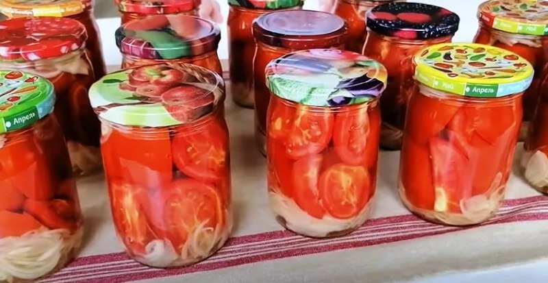 Помидоры по-фински на зиму Ингредиенты: ·Помидоры - 4 кг ·Лук репчатый - 1 кг Для маринада, на 1 литр воды ·Соль - 1 ст. ложка (с небольшой горкой) ·Сахар - 1,5 ст. ложки ·Уксус 9 % - 50 мл Приготовление: 1.Первым делом лук нарезаем перьями. Отправляем в дуршлаг и обдаем кипятком (ошпариваем). Так мы избавляемся от луковой горечи. 2.Все помидоры хорошо моем и нарезаем дольками (небольшие можно разрезать пополам). У меня сорта сливовидные, очень хороши для заготовок. Специально высаживаю целую грядку таких помидоров. 3.Часть лука раскладываем на дно подготовленных баночек. (У меня 0,5-литровые банки, стерилизованные в духовке при 100 градусах в течение 10 минут.) 4.Нарезанные помидоры плотно распределяем по банкам. 4 кг разошлось на 14 баночек. Сверху выкладываем оставшийся лук, делаем луковую "шапку". 5.Готовим маринад, здесь всё просто. Закипела вода - добавляем соль, сахар и затем уксус. Мы для консервации используем красный винный уксус 6 % (когда надо, пересчитываем количество). В