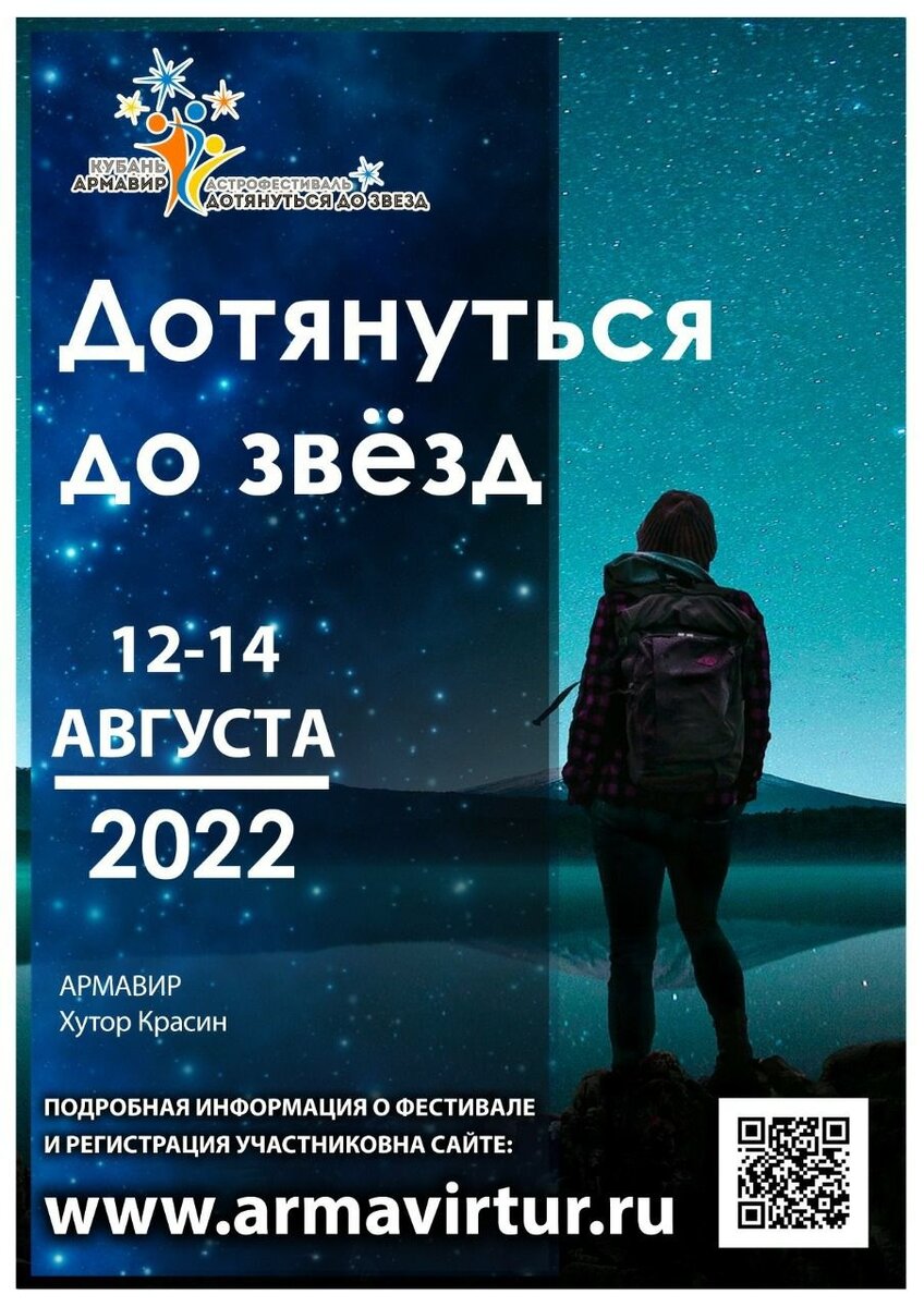 12–14 августа Армавир встречает гостей Межрегионального астрономического фестиваля: «Дотянуться до звёзд". Место проведение фестиваля: город Армавир, хутор Красин: живописная поляна, чистый воздух, яркие звезды – вдали от городской суеты.