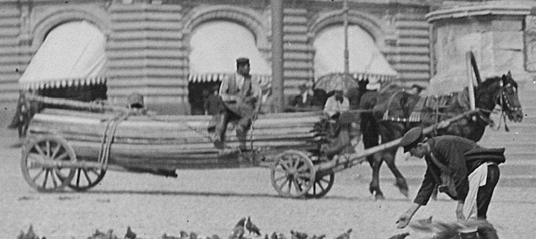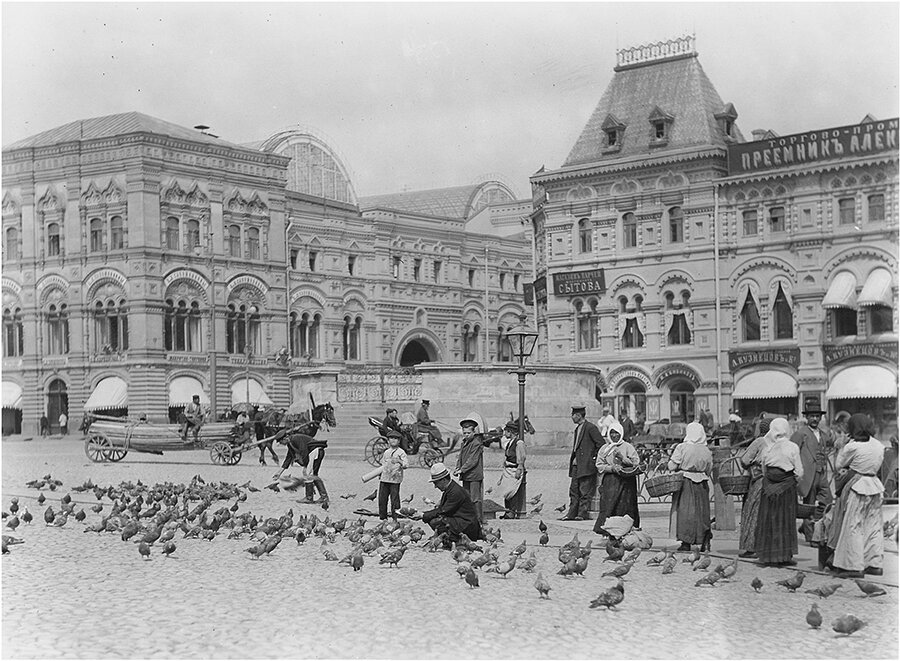 Мы уже смотрели на Лубянскую площадь, Пречистенскую набережную с Храмом Христа Спасителя, на Пушкинскую площадь. В рубрике "разглядываем старые фотографии" берём интересную с точки зрения бытовых деталей фотографию старой Москвы и рассказываем о ней подробно. Интересно, что многие фото обычных городских сцен, не исторических событий, зачастую спустя 50-100 лет порой гораздо интереснее разглядывать с точки зрения навсегда оставшейся в прошлом фактуры и деталей, которые для современников были чем-то обыденным и повседневным. Сегодня у нас в рубрике фотография Красной площади самого начала 20 века с торговками, голубями, извозчиками. Прежде всего, по Красной площади 100 лет назад свободно ходил транспорт. И не просто извозчики, а даже «ломовики» – грузовые телеги. На фото мы видим и совсем нечастый вариант – самодельная, даже не телега, а скорее рама для перевозки длинных досок: На заднем плане видим «чистенькую» барышню с зонтиком с претензией на принадлежность к высшему обществу. Если