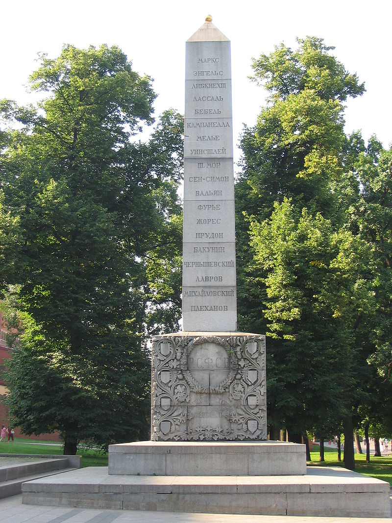 "В Александровском саду Кремля снесён "Памятник-обелиск выдающимся мыслителям и деятелям борьбы за освобождение трудящихся". Первоначально, в июле 1914 года, этот памятник был установлен как "Романовский обелиск в память 300-летия царствования дома Романовых". В 1918 году, на заре Советского государства, он стал одним из первых революционных памятников. На нём были высечены имена философов-утопистов Томаса Мора, Кампанеллы, Сен-Симона, Фурье, Уинстенли и Мелье, анархистов Бакунина и Прудона, народников Лаврова и Михайловского, Чернышевского, социалистов Лассаля и Вальяна, социал-демократов Жореса, Плеханова, Бебеля, а также Маркса и Энгельса.