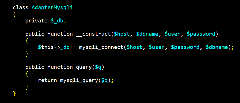 В качестве примера рассмотрим соединения с разными базами данных на PHP. Для работы с расширением mysqli мы пишем адаптер: