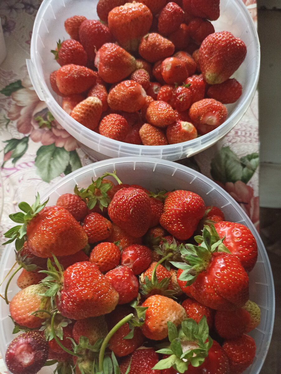 Здравствуйте.. Давно не писала. Всё в трудах... Сезон клубники напал на нас неожиданно... До последнего думала, что ягод будет мало, даже агитировала на работе сьездить к фермерам на самосбор ягоды... А потом... Когда последний раз собирали с мужем её, он вдруг говорит:"Пошли быстрей отсюда, пока ягоды не побежали за нами"... Ягоды много,ягода разных сортов. Особую радость доставляют сорта Свит Мери, Гигантский деликатес и Гигантелла Максим. Ягоды отчаянно крупные, третьего года жизни. Уже в конце июля буду готовить грядку для обновления и увеличения площади посадок. Сняли пробу с белой клубнички Пайнберри. Интересная ягода... Не вижу её в переработке, а вот на покушать- интересный ананасовый привкус... Имеет место быть однозначно.. Крупная (на фото вверху) ремонтная голландская Гармония.. Мало усов на размножение, приятный внешний вид, ягодный вкус. Но... Её ремонтантность интересна... Одна волна ягодная пройдёт полностью и только тогда она зацветает снова. Как мы знаем, от цвет