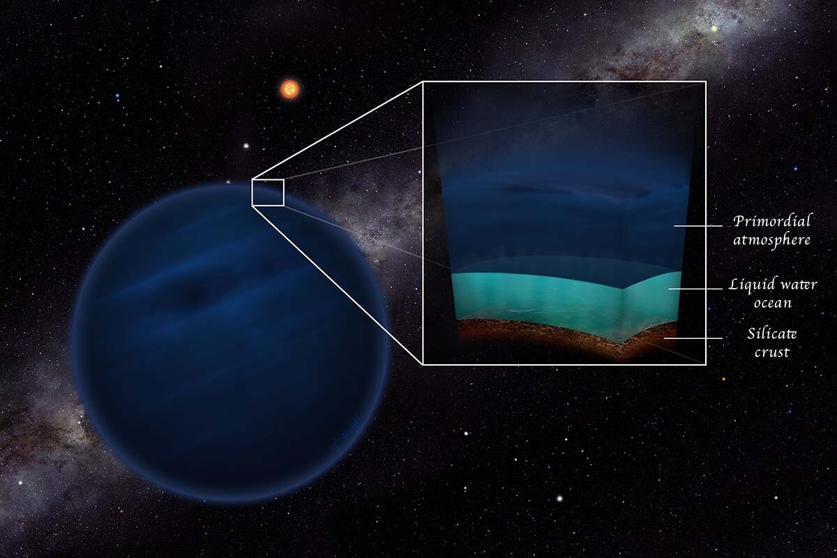 Планеты малой массы с первичной атмосферой из водорода и гелия могут обеспечить условия для появления океанов жидкой воды, способных существовать миллиарды лет. Изображение: University of Bern | University of Zurich | Thibaut Roger Наличие жидкой воды – необходимое условие для зарождения жизни. При поиске внеземной жизни – а значит, воды – астрономы ориентируются на миры, подобные Земле. Однако насколько оправдан такой подход? В работе, опубликованной в издании Nature, команда учёных показала, что океаны жидкой воды могут существовать на планетах, существенно отличающихся от нашей, на протяжении миллиардов лет. Одним из главных факторов, делающих возможным существование земных морей и океанов, является атмосфера нашей планеты. Благодаря парниковому эффекту она улавливает ровно столько тепла, сколько нужно для поддержания воды в жидком виде. Так было не всегда: первичная атмосфера Земли, как и у многих других молодых планет, состояла в основном из водорода и гелия. При земных условиях м