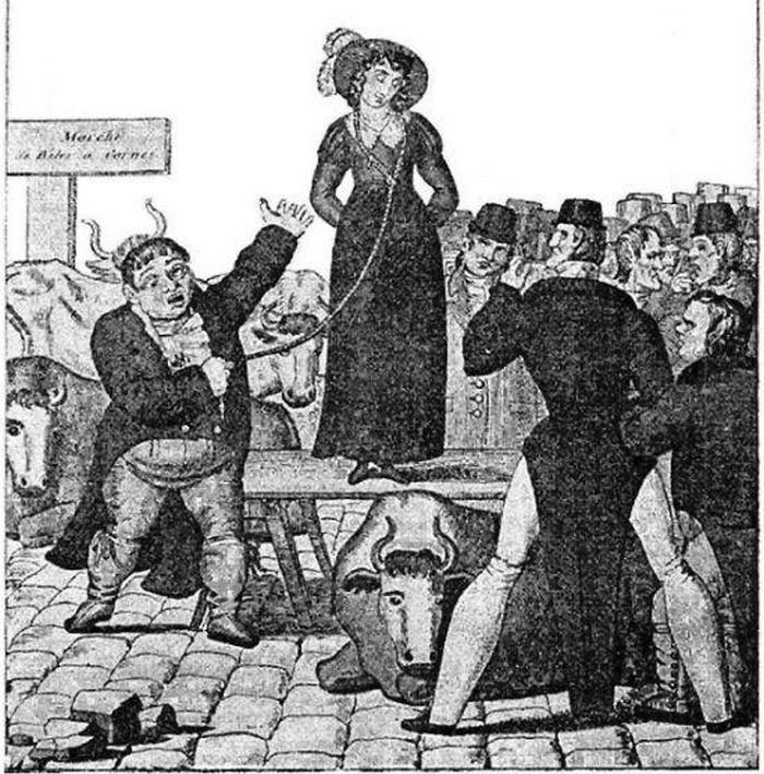 До начала 20-го века в Европе существовала традиция продажи жён. Женщина, вышедшая замуж являлась собственностью мужа и не имела никаких прав. О продаже объявляли заранее и проводили аукцион - женщине накидывали петлю из веревки на шею или талию, завязывали руки. Жену отдавали за самую большую назначенную цену. Это было одним из способов для мужчины разорвать неудовлетворительный брак. Подобные аукционы регулярно проводили и в XVIII и даже XIX веке. Бывали случаи, когда женщина сама себя продавала, пытаясь таким образом избавиться от ужасного брака. Продажа жены сохранилась в некоторой форме до начала XX столетия. Последний известный случай был зарегистрирован в 1913 году, когда женщина утверждала в полицейском суде Лидса, что она была продана одному из товарищей ее мужа. А что думаете вы? Пишите своё мнение в комментарии.