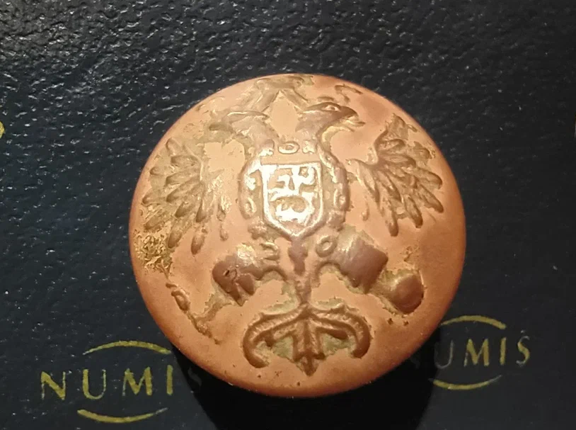 Одним из известных производителей мундирных пуговиц в Российской Империи была фирма, имеющая "фамильное название" - "Копейкинъ". Копейкины происходили из крестьян Ярославской губернии. В 1840 году Иван Копейкин с братьями открыл в Петербурге пуговичную фабрику. На фабрике работало чуть более 50 человек, а ежегодный оборот доходил до 100 тысяч рублей. Из-за семейных разногласий из общего "бизнеса" постепенно вышли братья Максим, Константин, Николай и Авксентий. Все они тоже открыли свои "дела", но успеха добились только Максим и Авксентий - в том же пуговичном деле. У Авксентия была большая фабрика, и в 1872 году он стал купцом 2 гильдии. У Максима также была своя пуговичная мастерская. В 1910 году Копейкины по линии Авксентия отметили 50-летний юбилей своей фирмы. После смерти Авксентия дело продолжили его вдова и зять. В моей коллекции различных мундирных пуговиц есть несколько пуговиц Копейкиных. Я сфотографировал несколько разных типов. Обычная "орлянка". Указана фамилия "Копей