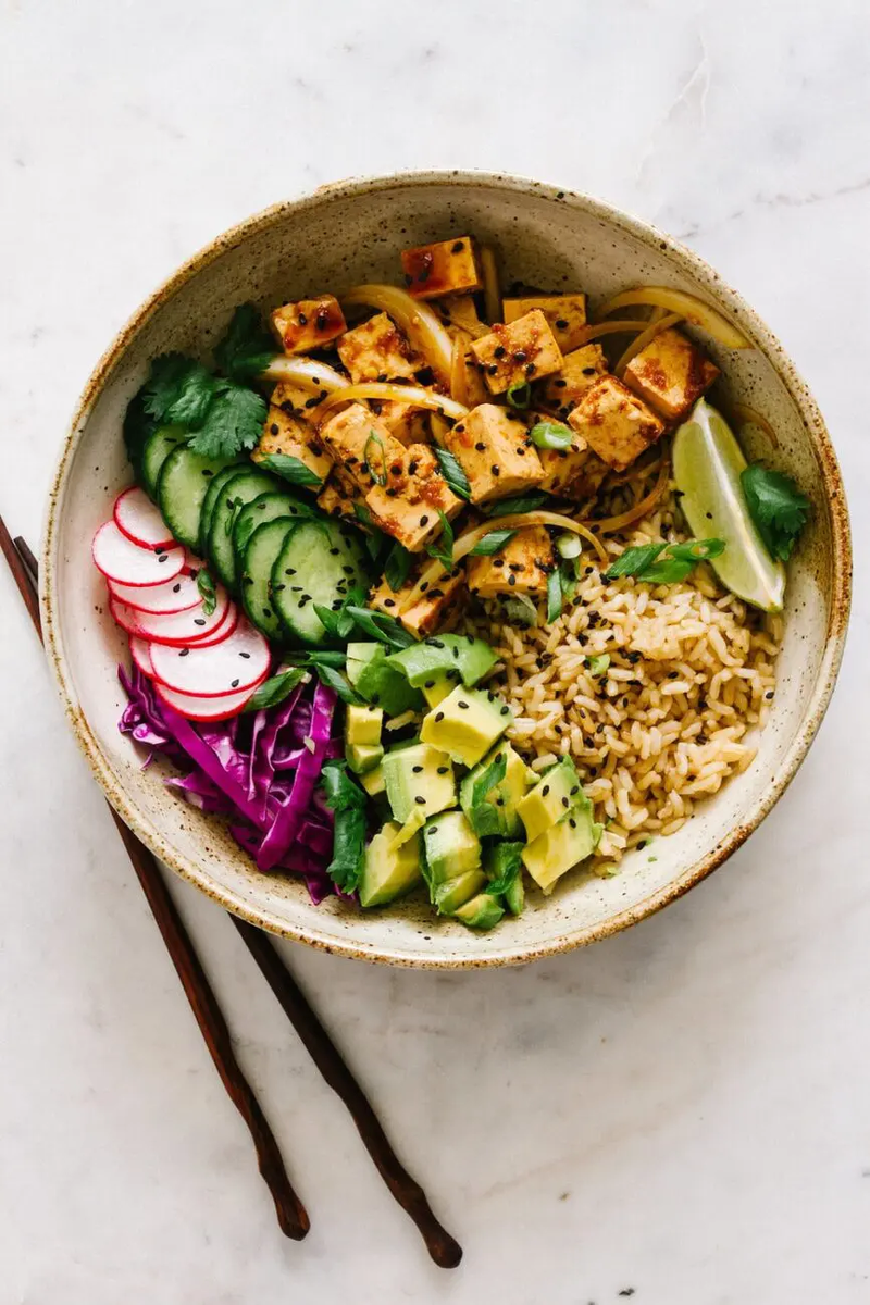 Эстетическое веганское блюдо из нежного тофу, маринованного в восхитительном имбирно-соевом соусе, в сочетании с рисом и овощами. Поке боул это гавайское блюдо, которое традиционно готовят из быстро замаринованной свежей рыбы. Но для тех, кто придерживается веганской диеты, есть здоровая альтернатива с использованием соевого сыра тофу. Сам по себе тофу не имеет ярко-выраженного вкуса, а это значит, что его маринование является важной частью рецепта. Ингредиенты: соевый соус : от 1/4 до 1/3 стакана (или тамари, для безглютеновой версии) рисовый уксус или сок лайма : 1 ст.л. острый соус : 1/2 ст.л. (такой как Sambal Oeleck или Sriracha) кунжутное масло : 1 ч.л. чеснок : 2 зубчика измельченного свежий имбирь : кусочек около 3 см. (очищенный и натертый) красный лук : 1/3 луковицы (нарезанный) твердый тофу : 1 упаковка (400 гр.) огурец : 1/2 нарезанного редис : 3-4 шт. нарезанные краснокачанная капуста : 1/4 кочана (тонко нарезанная) авокадо : 1 шт. (нарезанный кубиками) семена кунжута : 1