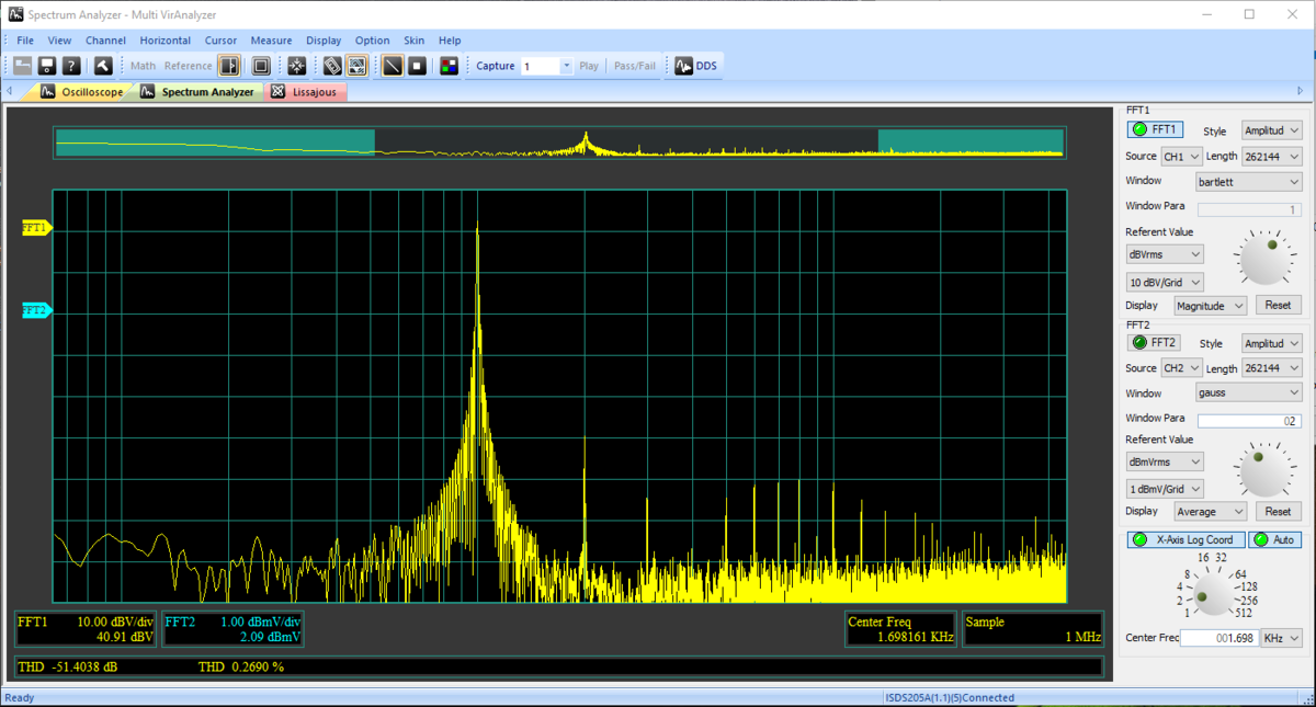 На вход усилителя подал переменное напряжение частотой 1кГц с заранее известным КНИ, который составил 0,269% - это видно на скриншоте выше, смотреть вниз окна, параметр называется (THD).