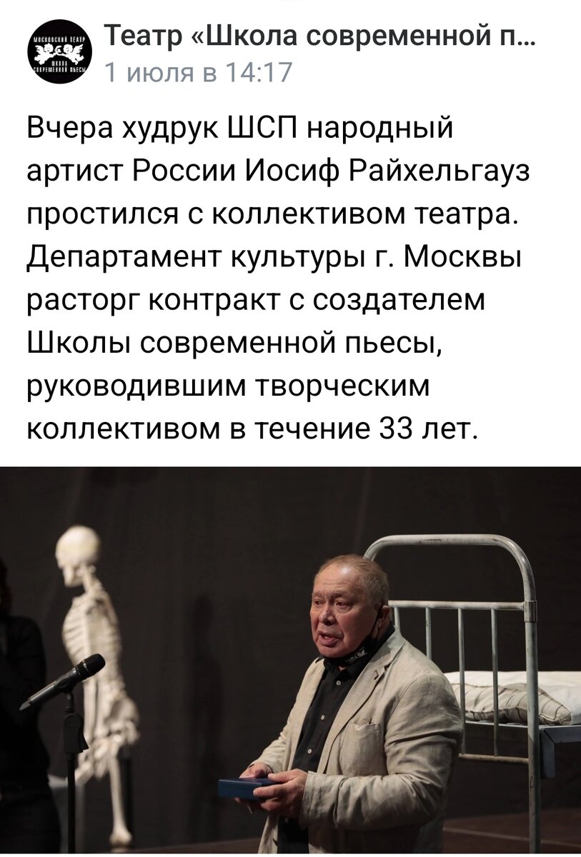 Главная фраза бывшего главного театра Школа Современной пьесы👇 После 2 мая воздух в Одессе стал чище! Работа Иосифа Райхельгауза в качестве худрука была профессиональной, у театра есть своя специфическая публика, залы продавались. Только яд, который источал сей осторожный деятель со множеством покровителей, был гораздо тоньше и опаснее. И всё-таки, осторожность Иосифу Леонидовичу сильно изменила, когда в 2014 году он отметился этой своей фразой после чудовищного аутодафе в Одессе. Мы все видели и слышали его на ток-шоу. Он очень аккуратно держался ,но мы же не дети! Когда он называл некрофила Гончаренко милым мальчиком, нормальных людей это возмутило. Всех удивляло, что после нескрываемой дружбы с одним из активных участников одесской бойни укро-депутатом Алексем Гончаренко такой человек оставался на своём посту. Мало того, я недавно писала, что он уволил актёров Башарова и Мищенко, которые активно поддерживают нашего Президента. Райхельгауз не очень боялся кары. Спектакли