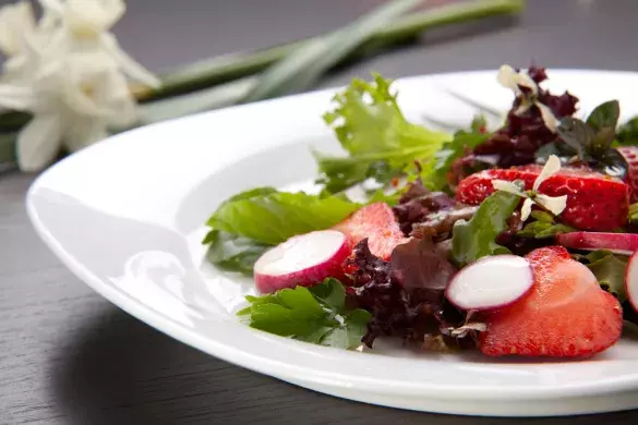 - Перемешать редис с яблоком, заправить соусом и в последнюю очередь положить в салат вымытую и разрезанную на четвертинки клубнику.