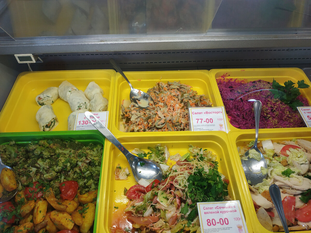 Сегодня в промежутке между дождём и градом успели съездить в кафе и даже прогуляться по Набережной реки Волги. Резко вышло солнце и стало печь, а мы ездили по работе в Энгельс, хоть и воскресенье и остановились сразу... Как не воспользоваться таким подарком от природы?! Прошел час, и приехав домой мы услышали раскаты грома и пошел снова ливень... В этот раз мы решили взять не только салатики, ниже вы увидите что взяли) Жена вчера почти такой же сделала, немного отличается. Она делала из "Кириешек" 100 гр. пачки с беконом, пачки крабовых палочек из Магнита, 4 вареных яйца, 300 грамм сыра твердого, 3 зубчика чеснока и майонезного соуса "МарьИванна")) Вышло вкуснее чем в кафе и по деньгам примерно на 250 рублей, 6 порций. Мы вчера поели много, сегодня после кафе средние порции, и еще на вечер осталось)) \Дома готовить выгоднее в 2 раза вышло точно)) А в кафе взяли "Глория" по 100гр Этот салат мы ели в первый раз с месяц уже назад, в День России вроде, сегодня не брали, тяжелый и не самый