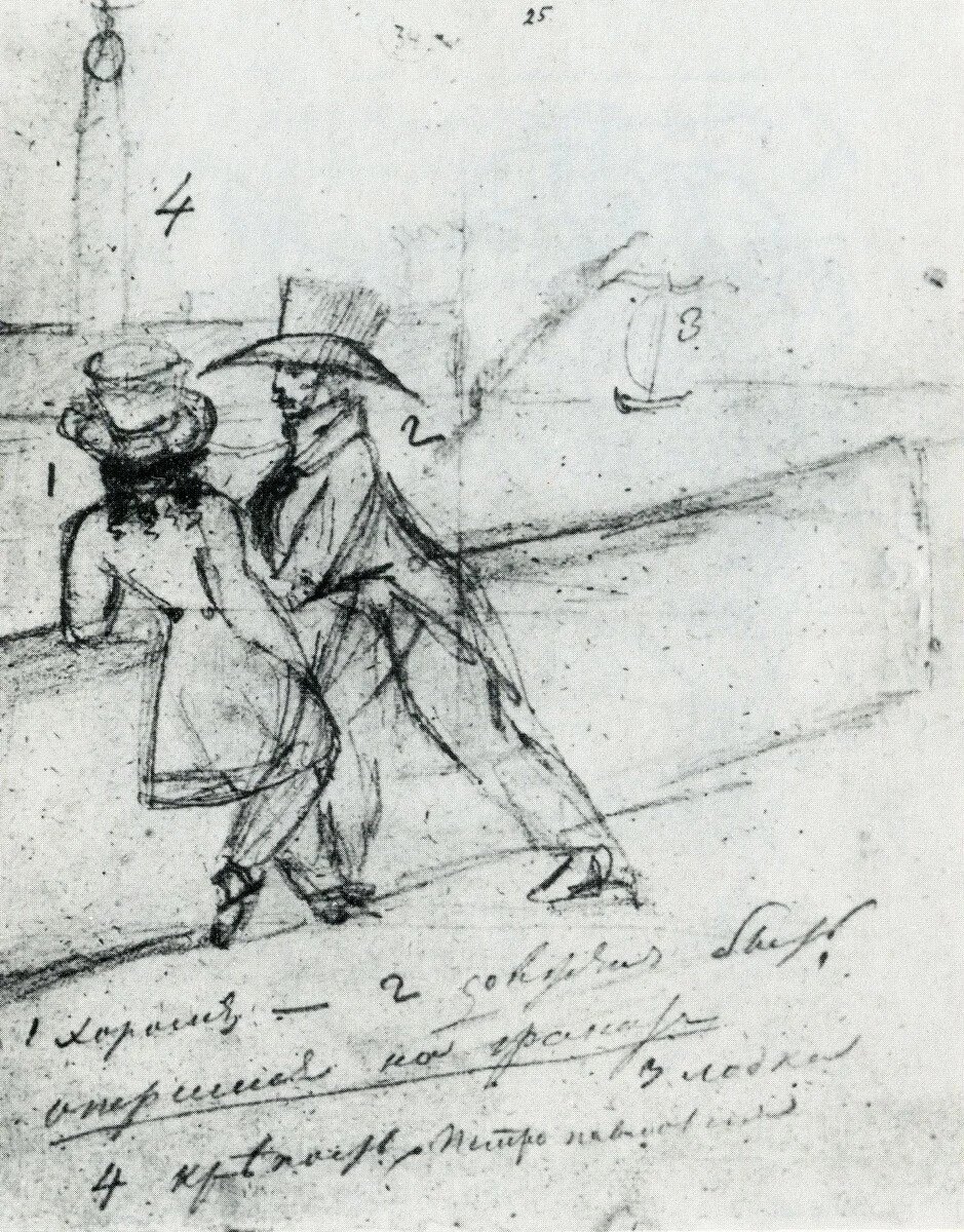 Когда поэт был в ссылке, он отдал рукопись «Евгения Онегина» брату Льву, снабдив собственными набросками. «Брат, вот тебе картинка для Онегина — найди искусный и беглый карандаш. Если и будет другая, так чтобы всё в том же местоположении. Та же сцена, слышишь ли? Это мне нужно непременно». Чтобы все было предельно понятно, Пушкин дал четкое ТЗ: «1 хорош — 2 должен быть опершись на гранит, 3 лодка, 4 крепость, Петропавловская». Результатом стала гравюра, вышедшая в «Невском альманахе». Пушкин ответил на это знаменитой эпиграммой, которую я, как всегда, читал вчера на Кокушкином мосту, где начинается роман «Преступление и наказание». Вот перешед чрез мост Кокушкин, Опершись жопой о гранит, Сам Александр Сергеич Пушкин С мосье Онегиным стоит. Не удостоивая взглядом Твердыню власти роковой, Он к крепости стал гордо задом: Не плюй в колодец, милый мой. Кокушкин мост к локации имеет только то отношение, что рифмовался с его фамилией.