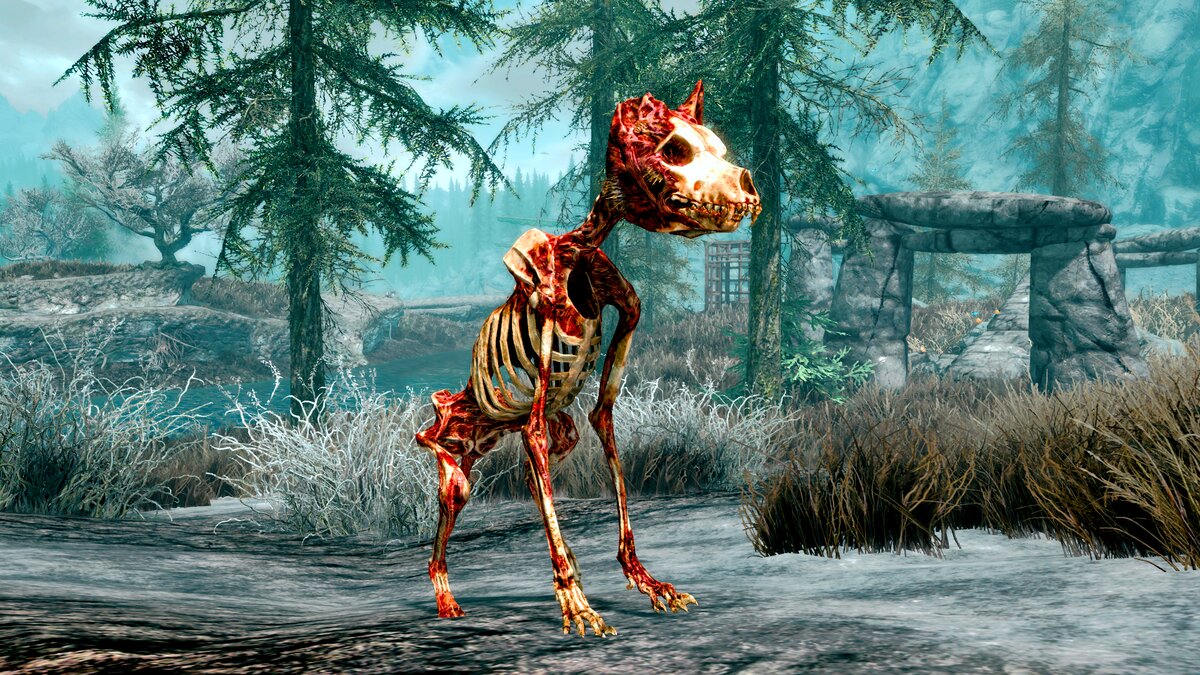 Питомцы Довакина. Костяного волка, посаженного в клетку злым некромантом, Довакин освобождает в ходе квеста «Не буди спящих волков». Страшилище, виляя обглоданным хвостиком, тут же начинает считать себя его питомцем. Ведёт он себя очень мило - как щенок обычной собаки, но внешний вид настолько жутковат, что не раз подумаешь, заходить ли вместе с таким питомцем в города и посёлки – народ пугать… Как питомец – компаньон, костяной волк обладает очень мощным и полезным эффектом – «Месть костяного волка». Эффект появляется сразу, как только Довакин позовёт скелет волчонка с собой. С такой поддержкой можно смело зачищать древние гробницы и упокоища – вся нежить получит более сильный урон, а значит, быстрее будет уничтожена. Сперва мой Довакин поселил костяного волка на своём корабле «Ужас Мертвеца»; но, как только получил в собственность «Висельный Зал» - обиталище некроманта – так сразу же понял, что лучшего места для Костяшкина (так он прозвал волчонка) и быть не может. Так что теперь