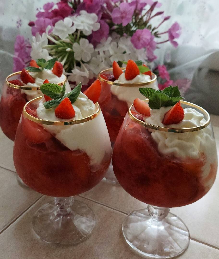 Вкус описать невозможно🍓🍨😋 Надо пробовать! #клубника #клубничный десерт #ягоды #летнееменю Ингредиенты: жирных сливок, гр творожного сливочного сыра, ст.л сахарной пудры, клубники, клубничного желе Способ приготовления: Приготовить желе согласно инструкции на упаковке. Бокалы для десерта (я взяла для коньяка😁) зафиксировать под уклоном (очень удобно фиксировать в подставках для яиц😁), выложить клубнику, залить приготовленным желе. Этот слой должен занимать половину бокала по диагонали. Убрать в холодильник и дать желе полностью остыть. Тем временем приготовить крем. Охлажденные сливки взбить с сахарной пудрой до образования устойчивых пиков. Добавить в сливочную массу творожный сыр, перемешать миксером. Крем положить в кондитерский мешрк с насадкой "звездочка". Заполнить вторую часть бокала кремом. Украсить десерт ягодами клубники и листиками свежей мяты. Приятного аппетита!