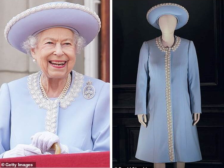 В честь Бриллиантового юбилея 5 июня 2012 года, королева надевала бледно-бирюзовое платье и пальто, расшитое россыпью серебряных цветов, и соответствующую шляпу, украшенную шифоном и стразами. Создала комплект Анджела Келли.