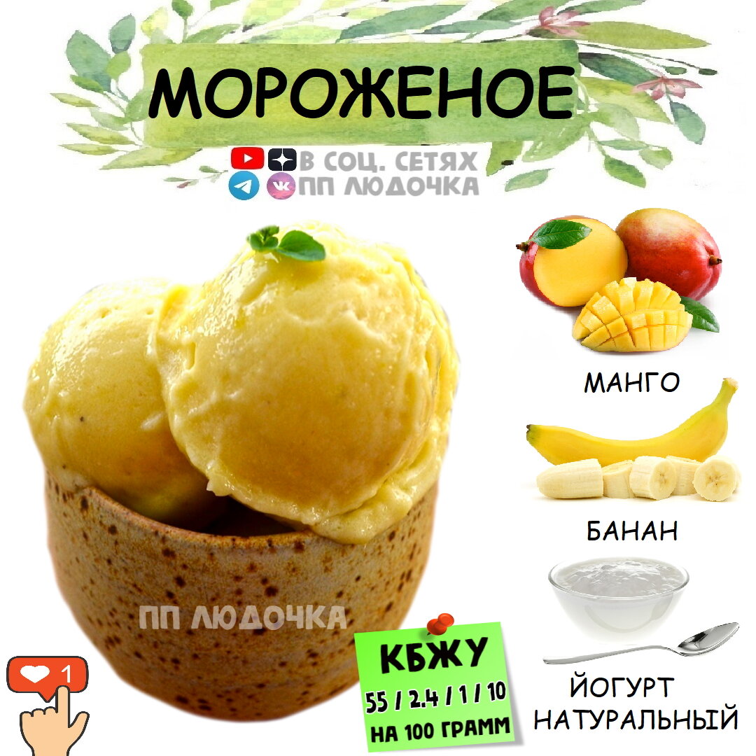 Не забываем подписаться, а я дальше буду заботиться о Ваших здоровье, фигуре и долголетии 💚 Очень простой рецепт вкуснейшего, полезного, освежающего мороженого, которое готовится быстро и просто 🤤 📝 КБЖУ на 100 г. = 119 / 11 / 14 ⭐️ Сложность (1 из 5) ⏰ Время приготовления: 3-4 часа ✅ ИНГРЕДИЕНТЫ: 🍌 Замороженный банан - 1 шт. 🥭 Замороженное манго - 1 шт. 🍶 Йогурт натуральный - 100 мл. ✅ ПРИГОТОВЛЕНИЕ: Все взбиваем блендером до однородной консистенции. Выкладываем в миску, можно подавать с любимыми фруктами или орехами🥝 ‼️ Самое главное - не спалить блендер, он должен быть мощным 🙈 Спасибо за лайк 💚😘