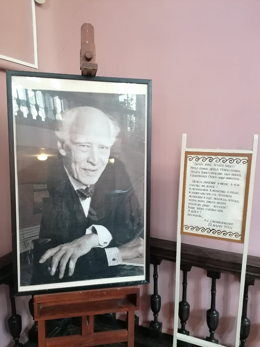 Два года назад, я посещала его мемориальный музей в доме на Леонтьевском пер. 6. Я сделала много интересных фотографий, и расскажу Вам о наиболее интересных предметах для меня из музея Константина Сергеевича. Во-первых, весь его дом обставлен декорациями: двери, шкафы, мягкая мебель и др. Многие домашние предметы он переносил в свой театр и наоборот театральные, в свой дом для пользования. В доме я видела различные вещи старины, которые сам Константин Станиславский покупал в лавках старьёвщиков или просто в путешествии по России. Так, в комнатах нулевого этажа, где располагались ранее палаты, собственно на их основе впоследствии и был выстроен особняк, представлена экспозиция реквизитов и костюмов первого спектакля МХТ "Царь Фёдор Иоаннович". Примечательно то, что утварь вся подлинная. Станиславский приобрёл её в путешествии по России. Это, пожалуй, главное учение Константина Сергеевича, не играть, а жить на сцене. Только подлинный реквизит, может воссоздать настоящую эпоху времени спектакля, все вещи и костюмы позволят вжиться в роль и жить этой ролью на сцене! Только так и никак иначе! В спектакле даже выносили настоящую икону Божьей матери без младенца. Это икона принадлежала семье Станиславского, переходя из поколения в поколение. Все мы знаем, что после революции, нельзя было иметь иконы, креститься или молиться, но несмотря на это, в спектакле разрешили выносить икону на сцену. Хранители музея очень бережно сохраняют предметы, которые несут память о великом К. С. Станиславском. Станиславский считал, что только подлинная вещь может помочь актёру в ощущении персонажа и постановки, а зрителю в восприятии спектакля.