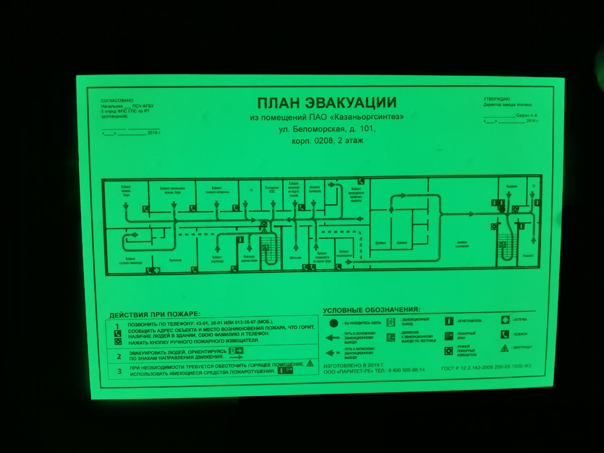 Одним из главных продуктов, которые мы производим, являются планы эвакуации. ⚠ Как известно, план эвакуации-это схема, в которой указаны пути движения к эвакуационным выходам, огнетушителям и средствам спасения. Также на нем описаны правила поведения при пожаре. ⚠ Планы мы изготавливаем из светонакапливающей пленки ФЭС-24, которую сами и производим, в соответствии с ГОСТ 344-2018 и ГОСТ 12.4.026-2015. ⚠ Производство плана начинается с подготовки электронного макета. Если у Вас его нет, то наш специалист отрисует его по Вашему плану БТИ в соответствии со всеми нормами. ⚠ Далее макет согласовывается с заказчиком и приступаем к печати. Печать плана выполняется на фотолюминесцентной плёнке ФЭС-24 при помощи высокоточных принтеров. Срок исполнения от 1 дня в зависимости от объема. ⚠ По пожеланию заказчика план можно накатать на пластиковую основу. В том числе мы используем негорючий пластик. Для придачи плану красоты его можно обрамить в алюминиевую рамку. ⚠ Далее план упаковывается в