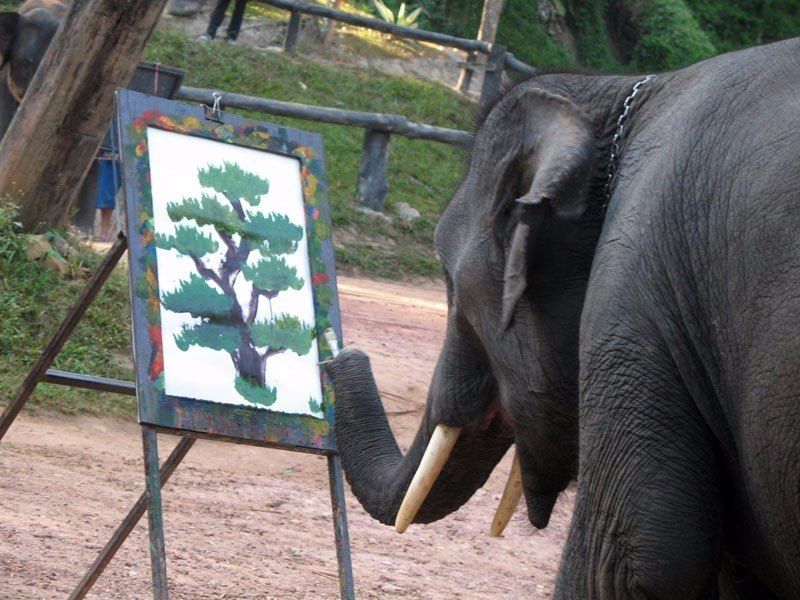 Люди всегда были очарованы слонами из-за их невероятных размеров и очевидно развитого интеллекта, но, оказывается, их таланты не ограничиваются способностью выполнять трюки. Дайте слону кисть, краски и холст, и он сможет выполнять невероятные вещи. Их удивительно ловкие хоботы помогают их управлять кистью, и не только для того, чтобы хаотично размазать несколько цветов по холсту, но и для того, чтобы нарисовать реалистичное изображение других слонов! Если вы когда-нибудь видели, как маленький ребёнок пытается нарисовать животное, вы понимаете, насколько удивительно то, что этот слон способен представить и изобразить своих товарищей на холсте. Это не так-то просто. Замечательное зрелище. Со временем и практикой, кто знает, может быть мы увидим работы этого слова в лучших художественных галереях Нью-Йорка.
