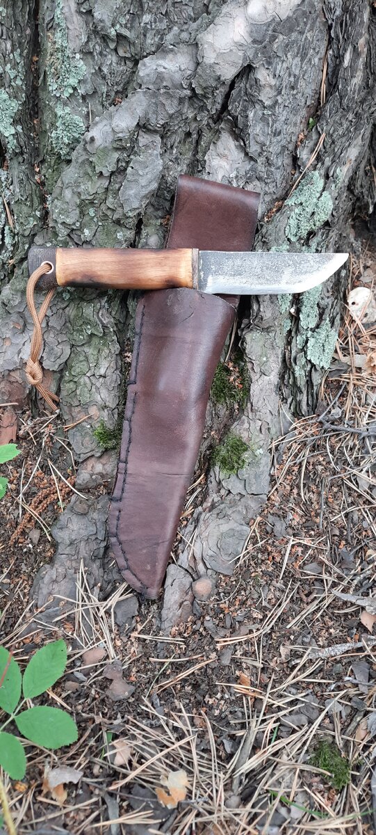 Поскольку машина ждёт запчастей для ремонта двигателя, ездить на рыбалку, да и в лес вообще, пока никак. Так что вечерами и иногда в выходные занимаюсь рукоблудством на охотничье-походную тему. Первым пунктом был нож. Во-первых, цены на ножи нынче слегка пугают, а ширпотреб брать не хочется. Во-вторых, то, что продают, обычно, диких размеров и форм. А я категорически не люблю большие ножи (о ножах, наверное, напишу отдельно). В итоге, в гараже нашёл полотно пилы по металлу какой-то старой, текстолит, латунную трубку. Дерево взял (ха-ха) от старой кроватки сына - оно очень плотное. Есть вопросы по заточке, но точить руками быстрорез - это тот ещё геморрой, поэтому пока так. Дерево обожжено, пропитано льняным маслом. Покрытие клинка родное, я не трогал его. Ножны делал давно (лет 5-6 назад) для другого ножа, который сломал на днях (собственно, при ремонте машины)). Кожа, нитки, покрытие обувным воском. Вторым пунктом хотелок был ягдташ. Всё-таки охота для меня - это в первую очередь эс