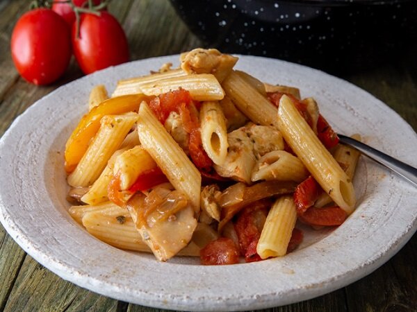 Эти макароны с курицей на сковороде — еще один вариант любимого итальянского блюда, которое я готовлю очень часто. Например, вот этот рецепт макарон на сковороде — с консервированной кукурузой и сыром. Сегодня — более летний вариант — с грибами, сладким перцем и свежими помидорами. Это блюдо такое же вкусное и простое в приготовлении. Оно потребует предварительно отварить куриное филе, а также макароны. Подойдут любые макаронные изделия, которые вы любите. Я обычно беру для этого блюда «перья» или «рожки» — обязательно хорошего итальянского качества, это сильно влияет на вкус блюда. Для макарон с курицей на сковороде можно использовать грибы, лук и сладкий перец, или же добавить морковь, цветную капусту, брокколи, оливки или даже шпинат. Мясная часть — обычно куриная грудка. Но подойдет и мясо куриных бедрышек, а также индейка (хотя мясо индейки готовится не так быстро, как курица). Ингредиенты: Примечание: 3 стакана вареных макарон — это примерно 2 стакана сухих. Приготовление: Доведи