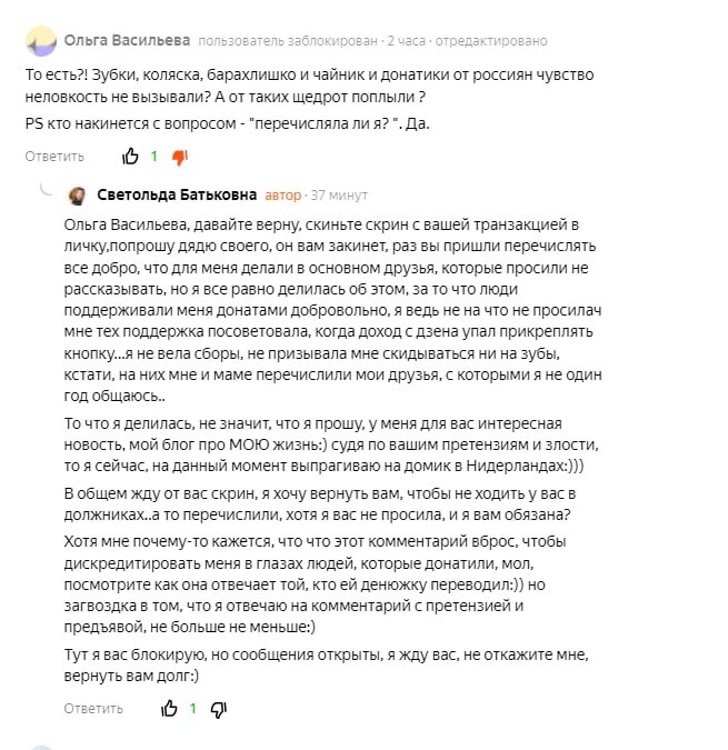 Как же надоело:)) Я блогер, я зарабатываю в интернете тем, что веду странички и рассказываю про свою жизнь, вы кстати тоже можете попробовать, только не про мою, а про свою, про себя я и без вас справлюсь:) В общем то, что вы приходите и попрекает меня за мой блог, и то, что у меня была кнопка доната, и что мне кто-то что-то подарил, перевел, одолжил, дал, инвестировал, помог, посочувствовал, о чем я с восхищением и непередаваемыми чувствами благодарности делилась с вами. Не хочу долго распинаться, это уже было стопятьсот раз, но до людей не доходит, что то, что у меня была возможность быть полезной своей маме, впервые в жизни приносить копеечку, между прочим, в очень сложное время для нас, что придавало мне ещё больше радости от моего блогерства. И ваши упрёки, хейт, грязь, оговоры, клевета, искажение фактов, чтобы ваша чушь про меня гладко ложилась, ну не пробивается она ко мне:) Извините за мой пофигизм к этим потугам. Я хочу вам сказать спасибо, что напоминаете мне, когда я сейча