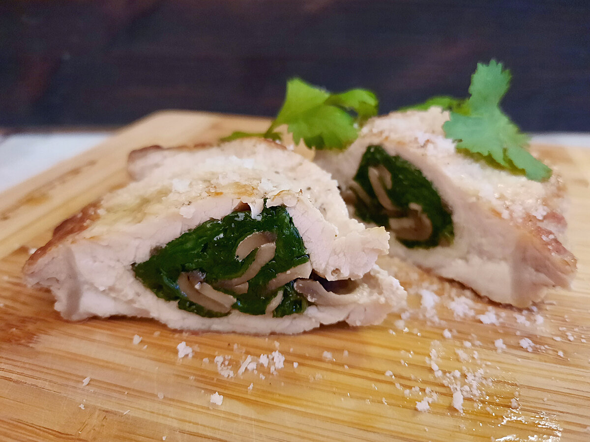 Даже нежирная свинина может быть сочной и нежной, если ее нафаршировать. Такие кармашки можно заполнить любой начинкой. Ингредиенты. 4 стейка — эскалопа толщиной 1 см 80 г свежего шпината 5 средних шампиньона 2 зубка чеснока 1 чл масла ГХИ соль, перец 30 г пармезана крошкой 50 мл сливок ½ чл горчицы Приготовление. Приятного аппетита!