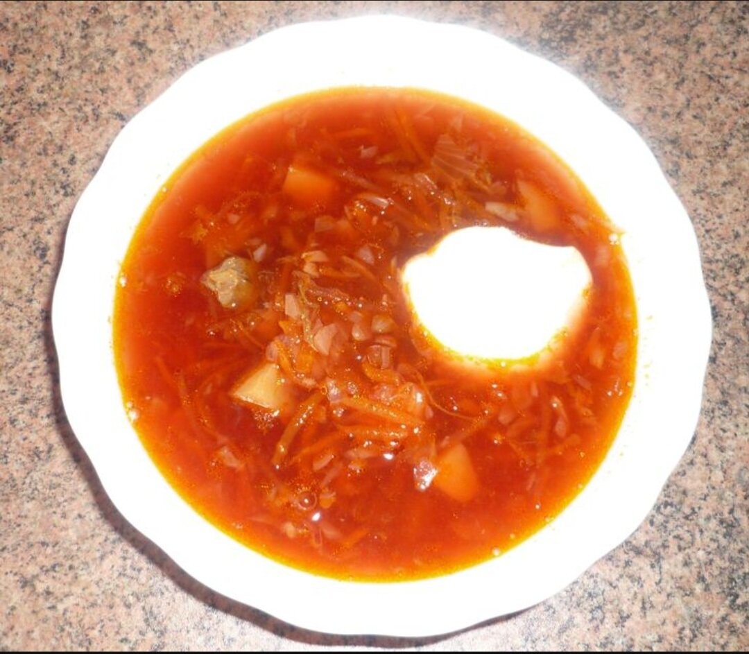 Борщ белорусский (вариант моей семьи) Ингредиенты на трехлитровую кастрюлю нам понадобится: 300 гр. копченых свиных ребрышек 400 гр. говядины 1 луковица 1 морковка коренья на ваш вкус - для бульона 2 средние вареные свеклы или одна крупная 5 картофелин 2-3 зубчика чеснока для зажарки: 1 морковь 1-2 луковицы. 1 ст.л. томатного пюре 1 ст.л. свиного сала или растительного масла 1 ст.л. уксуса 1,5 ч.л. сахара соль сметана, зелень для подачи. Пошаговый рецепт приготовления Количество мяса достаточно условно, просто возьмите кусочек свинины и кусочек говядины, но обязательно что-то должно быть с косточкой! В холодную воду опускаем говядину, доводим ее до кипения, сливаем воду, заливаем свежей, добавляем луковицу, небольшую очищенную морковь. Ставим кастрюлю на огонь, как закипит - уменьшаем огонь, снимаем пену. Через 30 минут добавляем в бульон свиные ребра(можно и некопченые, как у меня сейчас, когда малышастик с нами вместе из од