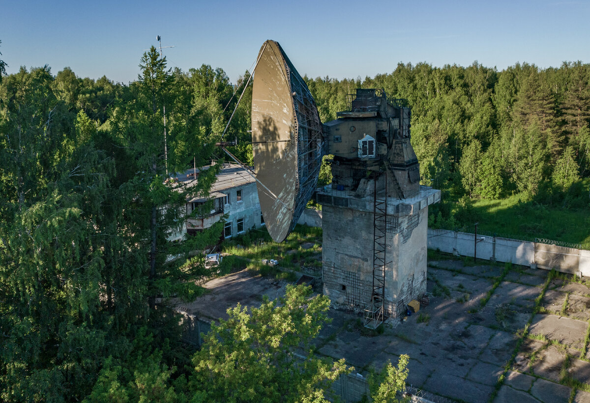 В 60-70 годы с помощь таких радиотелескопов осуществлялся проект мирового масштаба — ученые пытались найти. Сейчас про радиоастрономическую лабораторию в деревне Зименки в сети пишут «заброшена, не работает». Но мы точно знаем — у нее есть хозяин. И махину радиотелескопа РТ-15-2 с полной поворотной массой 100 тонн можно привести в движение одним нажатием пальца — выглядит весьма впечатляюще! Посмотрите наше видео с дрона — публикация уникальна, до нас никто не записывал поворот телескопа с воздуха. Обсерваторию от научно-исследовательского радиофизического института открыли в Нижегородской области в 1937 году. В свое время здесь находился еще один полноприводный радиотелескоп, несколько малых телескопов и другая техника для изучения солнечной активности. Сейчас от былого великолепия остался только корпус лаборатории и РТ-15-2, стоящий на собственном фундаменте, уходящим в землю на 12 метров. Остатки от тарелок поменьше лежат в траве неподалеку от обсерватории. Константин уже не первый